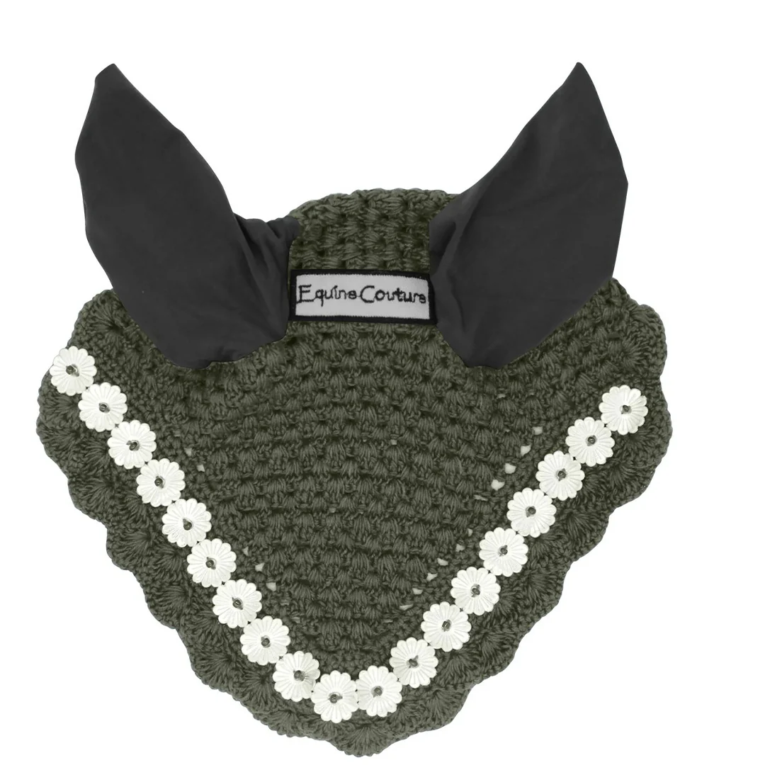 The Floral Fly Bonnet by Equine Couture is cute, unique accessory for any pony lover! Silver flowers along the edge add an adorable daisy design, perfect for summer time trail rides. Ear bonnets are a great choice to block flies around the ears in the hot summer time. Horses that are hyper-sensitive to sound will appreciate the muffling effect that bonnets provide, creating a more focused horse. The Spandex fabric allows for total ear rotation and freedom of movement. With a knit/crochet pattern, many holes allow for adequate air flow.